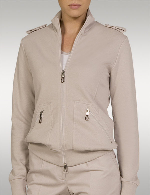 Ladies’ zip through jacket made with french terry fabric. This model features front pockets with zips with black metal sliders and power cable pullers, epaulettes detailing on the shoulders and rib collar, cuffs and hems. Ideal for the not-formal-evening outfits, or during the cold spring or autumn days. It perfectly matches the men’s zip through jacket Grant.